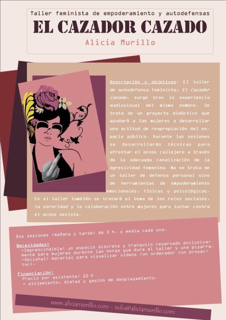 Descripción y objetivos: El taller feminista de empoderamiento y autodefensas , El Cazador Cazado, surge tras el proyecto audiovisual del mismo nombre. Se trata de un proyecto didáctico sobre la actitud de autodefensa que ayudará a las mujeres a desarrollar una actitud de reapropiación del espacio público así como herramientas para afrontar el acoso callejero a través del despertar de la agresividad femenina. No se trata de un taller de técnicas físicas sino emocionales y psicológicas. En el taller también se tratará el tema de la sororidad y la colaboración entre mujeres para luchar contra el acoso.