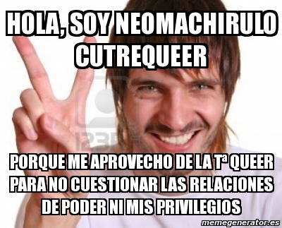 Otro espécimen es el cutre-queer (término acuñado por las mujeres de MemesFeministas a quienes saludo efusivamente desde aquí, hola amores). Son individuos que aprovechan la teoría queer para infiltrarse. Bajo la consigna “el género es una construcción social” dejan de cuestionar su posición favorecida de persona con pene y barba. Algunos incluso se hacen pasar por personas transexuales y aseguran estar hormonándose pero por alguna razón nunca les cambia el cuerpo, ni pierden vello, ni cambian de voz (sí, así de mal está la peña). La mayoría de ellos visten, hablan y se comportan como la sociedad espera que un hombre vista, habla y se comporte. Son verdaderos privilegiados por el sistema patriarcal cuando van a una entrevista de trabajo o vuelven a casa a las 4 de la mañana sin riesgo a que lo agredan. Gozan de todos los privilegios patriarcales pero no se les puede recordar porque se ofenden mucho, les “tortura” esta posición social de opresor que les ha tocado vivir. No soportan que nadie les hable de sus genitales y si osas llamarlo “hombre” la furia de los dioses machirulos recaerá sobre ti. Eso sí, ellos te hablan mal, usan también de forma sistemática el imperativo y el tono paternalista lo camuflan con el “nena”, “mona”, “cielo”, “cariño” que tan queer y delicado lo hace parecer.