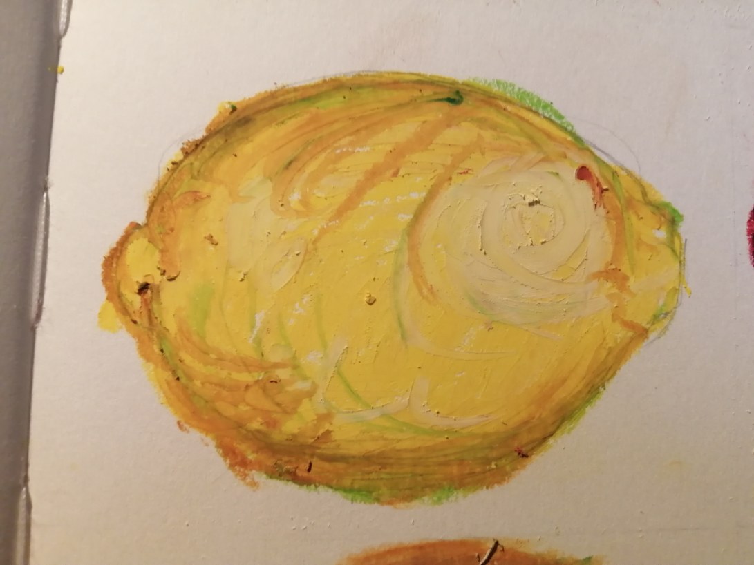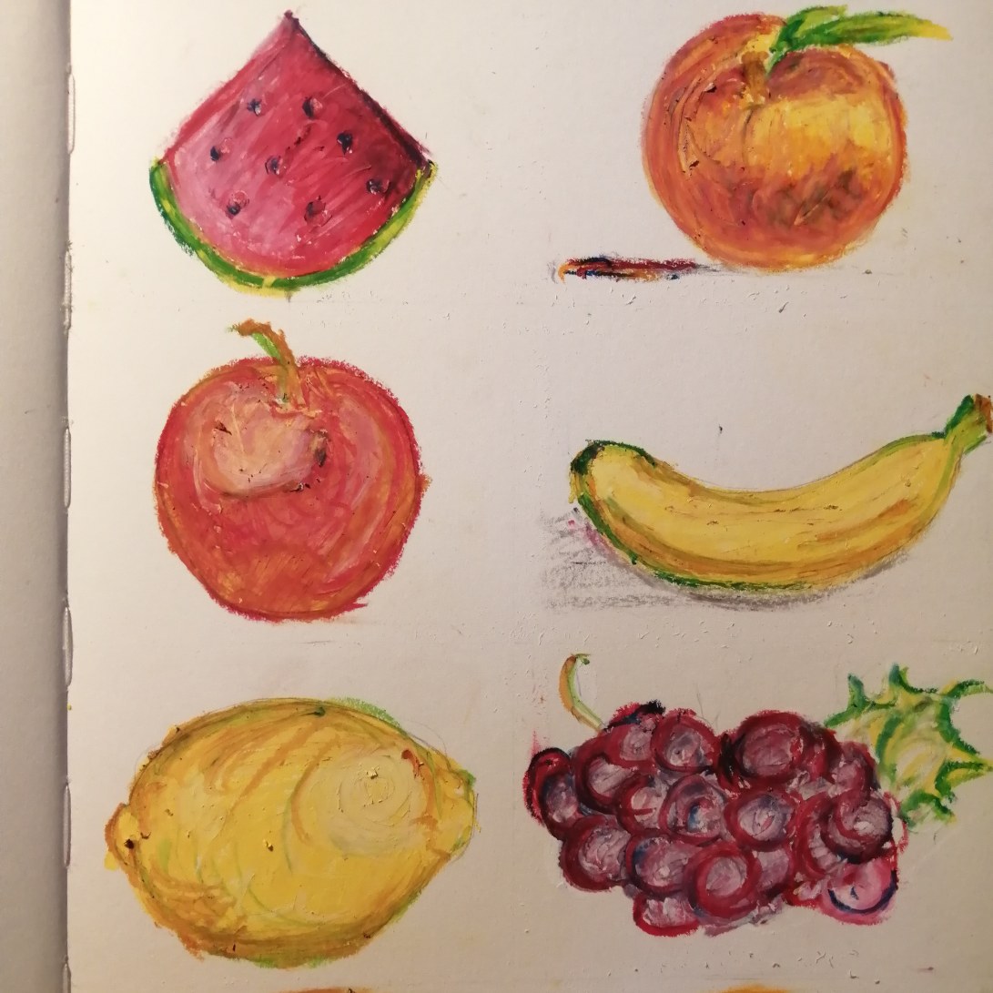 «Covid 19», grafito sobre papel.Fragmento de «Frutas», óleo pastel sobre papel.«The Moon», grafito sobre papel.Sin título, grafito sobre papel.«Caracol», grafito sobre papel.Fragmento de «El pollo Sauron», grafito sobre papel.«Frutas»,óleo pastel sobre papel.